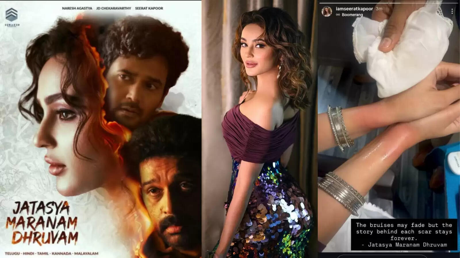 अभिनेत्री सीरत कपूर, जो जल्द ही पैन-इंडियन साइकोलॉजिकल सस्पेंस थ्रिलर ‘जातस्य मरणं ध्रुवम्’ में नजर आने वाली हैं, ने हाल ही में अपने सोशल मीडिया पर एक ईमानदार और बिना फिल्टर वाला वीडियो साझा किया जिसमें वह शूटिंग के दौरान लगी चोट को दिखा रही हैं। इस वीडियो में सीरत अपनी लाल और सूजी हुई कलाई पर आइस पैक रखते हुए दिखाई दे रही हैं — ये चोटें फिल्म के इमोशनल और इंटेंस क्लाइमैक्स सीन की शूटिंग के दौरान लगीं।