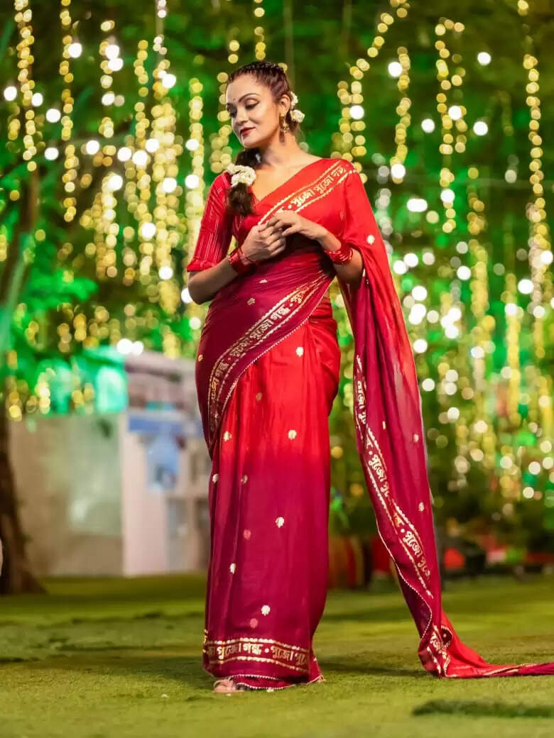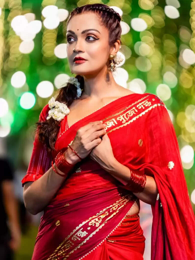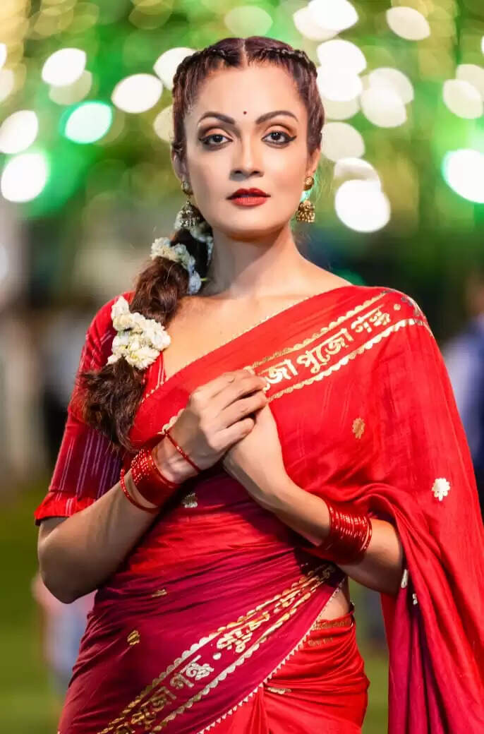 दुर्गा पूजा के पवित्र सार में कदम रखते हुए, अभिनेत्री शीना चौहान, जिन्होंने द ट्रायल में काजोल के साथ अभिनय किया, ने सच्ची शक्ति को मूर्त रूप देते हुए एक भारतीय देवी की भव्यता और कालातीत सुंदरता को प्रसारित किया। सीमा पर मुद्रित हस्तलिखित बंगाली पाठ के साथ सुता द्वारा एक आश्चर्यजनक सुरुचिपूर्ण लाल साड़ी में लिपटे, शीना का रूप देवी दुर्गा की आंतरिक शक्ति और कृपा का सही अवतार बन गया। साड़ी ने न केवल उनकी भारतीय विरासत को उजागर किया, बल्कि दुर्गा की भयंकर ऊर्जा को भी सामने लाया, जो उनके भीतर की ताकत और सुंदरता को प्रदर्शित करती है।