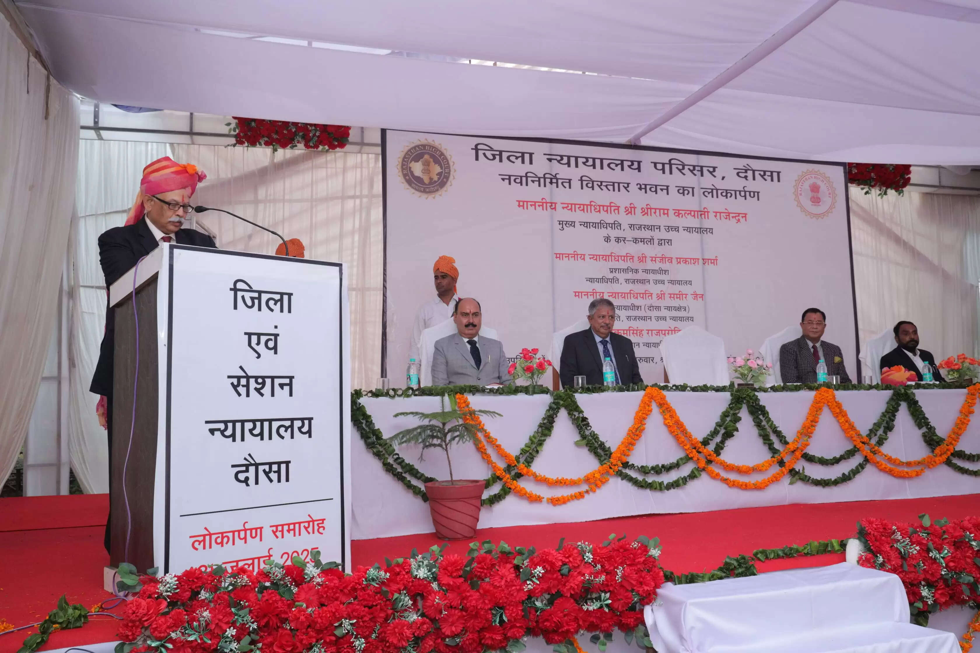 Dausa: देवभूमि दौसा की धरती गुरुवार को एक ऐतिहासिक क्षण की साक्षी बनी, जब न्याय के मंदिर की नई कड़ी के रूप में नवनिर्मित न्यायालय भवनों का लोकार्पण समारोह अत्यंत गरिमामयी एवं प्रेरणादायक वातावरण में सम्पन्न हुआ। राजस्थान उच्च न्यायालय के मुख्य न्यायाधिपति श्री श्रीराम कलपाति राजेन्द्रन के कर-कमलों से दौसा न्यायालय भवन में नवनिर्मित छह न्यायालय भवनों का लोकार्पण किया गया। मुख्य न्यायाधिपति श्री श्रीराम कलपति राजेन्द्रन ने राजस्थान उच्च न्यायालय में कार्यभार ग्रहण के बाद पहली बार दौसा में आगमन किया। उन्होंने कहा कि दौसा की धरती, पंच महादेव और चाँद बावड़ी जैसे धरोहरों से समृद्ध है और वे यहां आकर अभिभूत हैं। उन्होंने नवीन न्यायालय भवन के बारे में बताया कि यह भवन न्याय वितरण को दक्षता, गरिमा और संवेदनशीलता से जोड़ने की दिशा में महत्त्वपूर्ण कदम है।